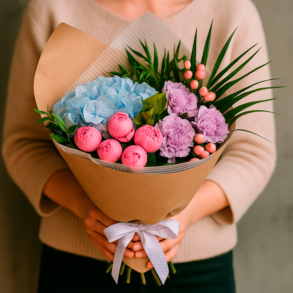 Голубая гортензия, розовые пионовидные розы и сиреневые гвоздики создают гармоничную композицию, дополненную гиперикумом и зеленью фисташки и папоротника. Букет оформлен в крафт-бумагу с матовой плёнкой и перевязан белой лентой в горошек. Возможны альтернативы упаковки: атласная лента или декоративная сетка. Прекрасный подарок для любимой на день рождения.