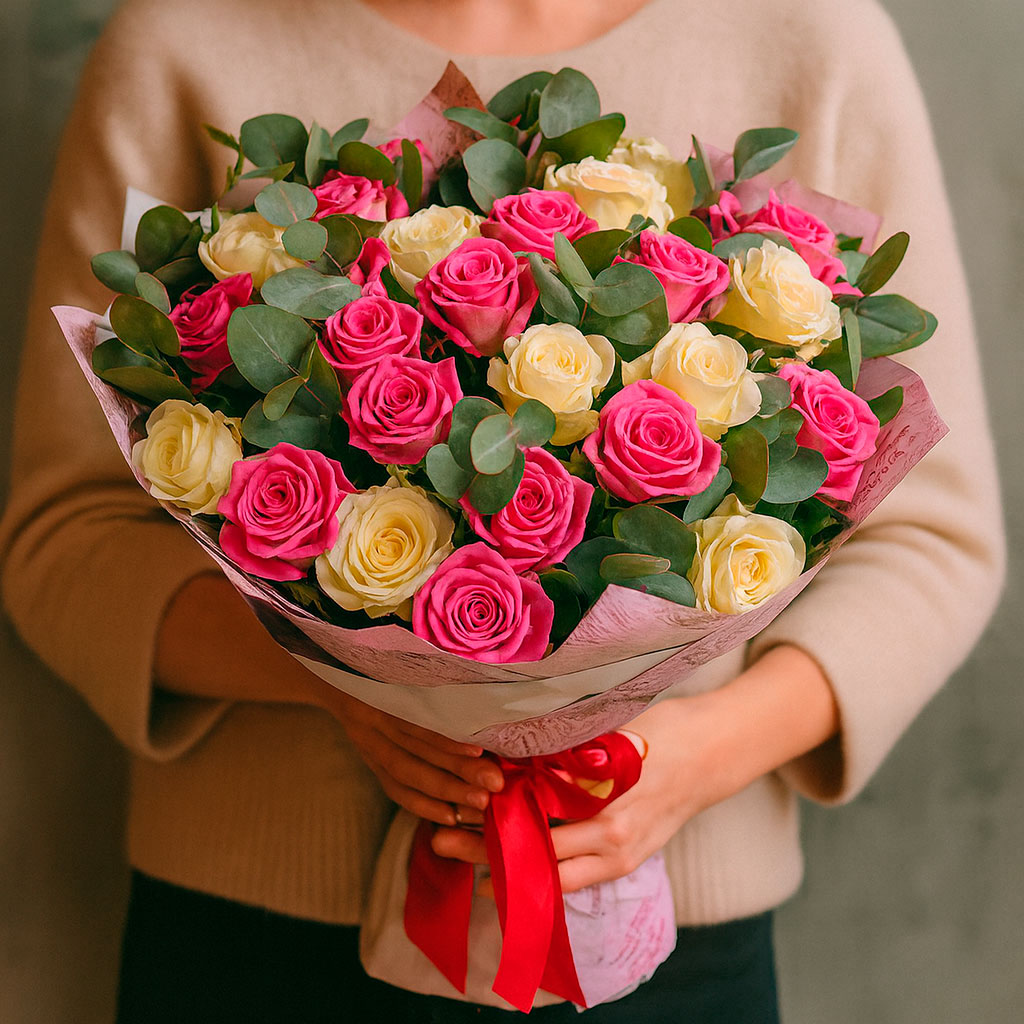 Роскошный букет из кремовых и розовых одноголовых роз, дополненный свежим эвкалиптом, создаёт атмосферу нежности и утончённости. Упакован в матовую плёнку с крафт-бумагой и перевязан яркой красной лентой. Возможны альтернативы упаковки: атласная лента или декоративная сетка. Прекрасный выбор для любимой на день рождения.