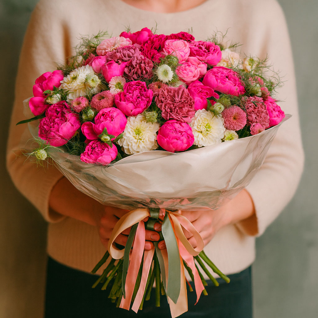 Роскошное сочетание розовых пионов, нежных розовых гвоздик, сиреневых кустовых хризантем и белых георгинов создаёт неповторимую композицию. Букет перевязан атласной лентой и обёрнут в матовую плёнку, что придаёт ему изысканный вид. Альтернативные варианты упаковки: крафт-бумага или декоративная сетка. Прекрасный выбор для подарка на день рождения для любимой.