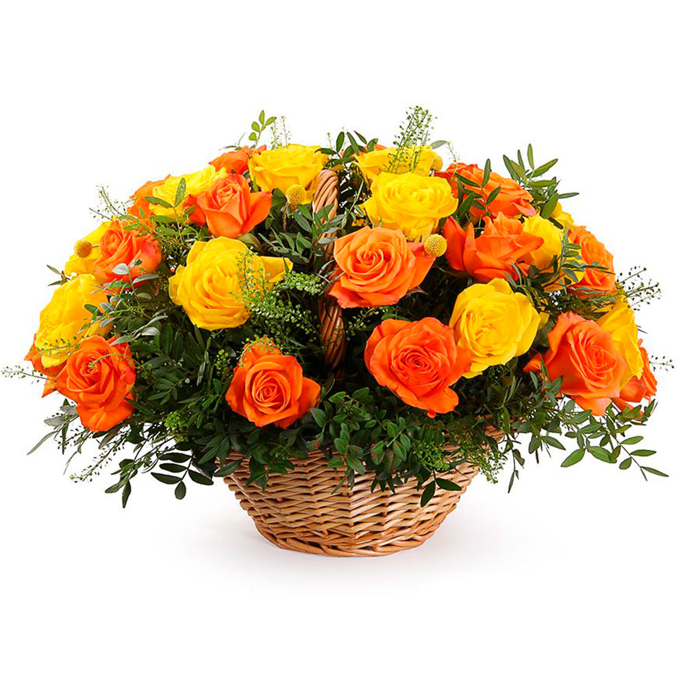 Яркие жёлтые и оранжевые розы в сочетании с зеленью создают праздничное настроение. Композиция оформлена в плетёной корзине с оазисом, что обеспечивает свежесть и долговечность. Возможны альтернативы оформления: корзина из лозы или корзина из ротанга. Прекрасный подарок для мамы на день рождения или юбилей.
