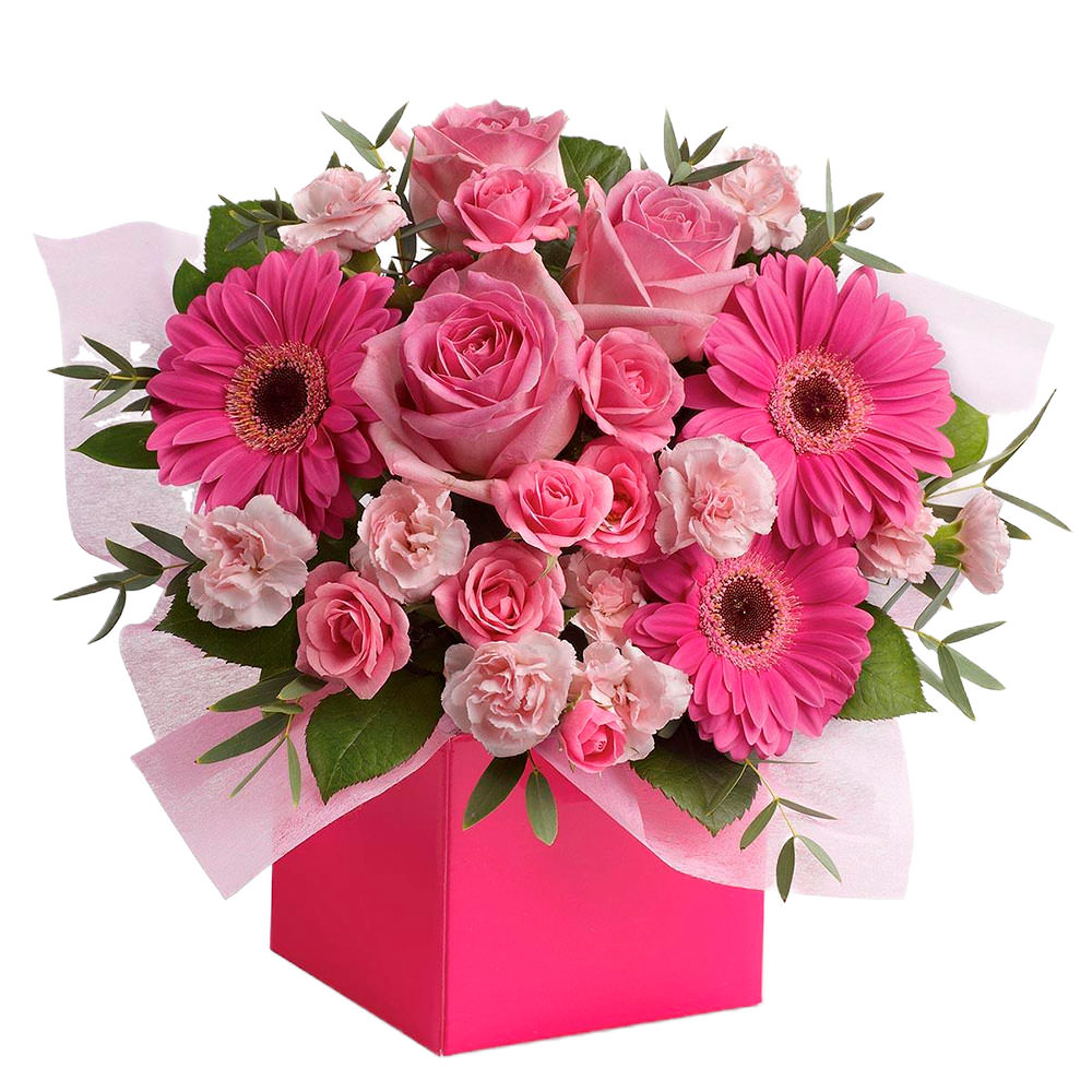 Розовые розы, кустовые розы и герберы создают нежную гармонию с мини-гвоздиками и фисташкой. Композиция оформлена в яркой квадратной коробке, что придаёт ей современный вид. Возможны варианты в бархатной или атласной коробке. Прекрасный подарок для любимой на день рождения.