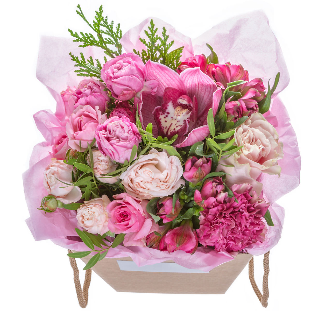 | Состав: | Розы, Альстромерии, Гвоздики, Орхидеи, Пионы |
