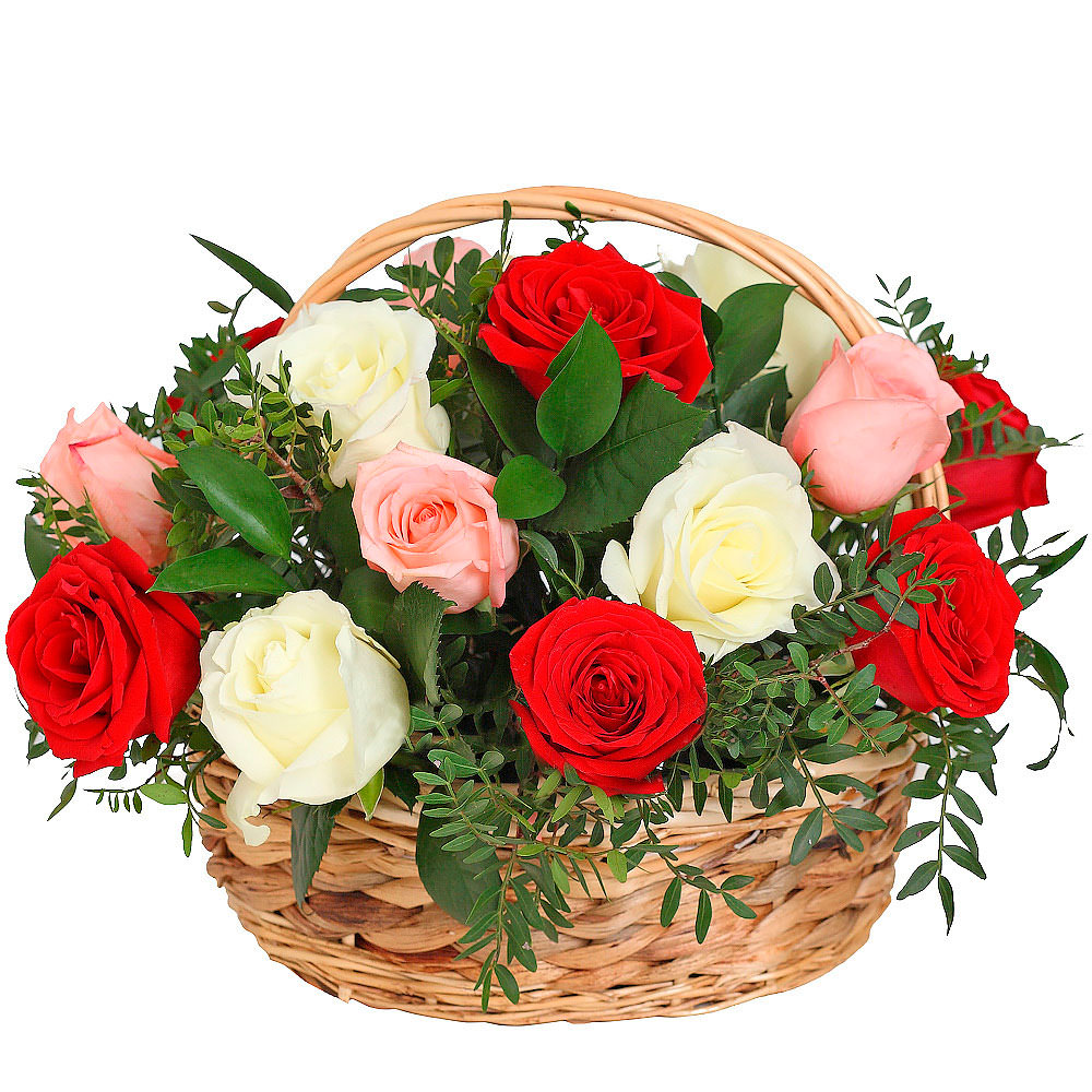Эта изысканная композиция сочетает в себе розы одноголовые в белых, розовых и красных оттенках, дополненные свежей фисташкой и зеленью. Цветы аккуратно расположены в плетёной корзине с оазисом, которая сохраняет их свежесть. Для альтернативного оформления можно выбрать корзину из лозы или корзину с тканевой отделкой. Прекрасный подарок для жены на годовщину или для мамы на день рождения.