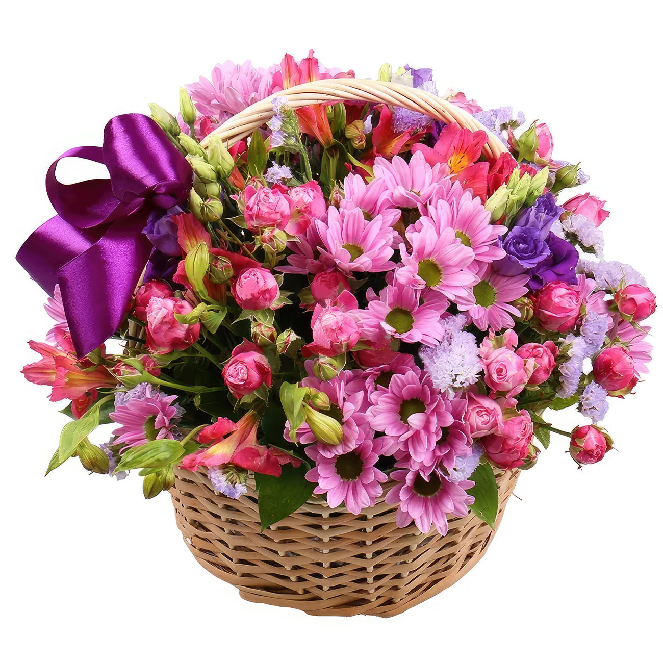 Розовые кустовые хризантемы и альстромерии создают нежную основу этой композиции, дополненную фиолетовыми эустомами и розовыми кустовыми розами. Статица добавляет легкости и воздушности. Корзина из лозы украшена яркой фиолетовой лентой. Возможны варианты оформления в корзине из ротанга или с тканевой отделкой. Прекрасный подарок для мамы на День матери или для подруги на день рождения.