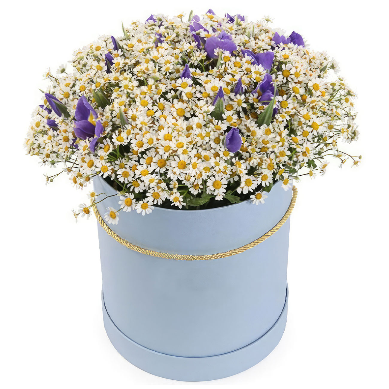 Ромашки и ирисы создают нежную и яркую композицию, наполненную летним настроением. Цветы аккуратно размещены в голубой шляпной коробке, которая подчёркивает их свежесть и изящество. Возможны альтернативы оформления: бархатная коробка или коробка с принтом. Прекрасный подарок для любимой на день рождения или годовщину.