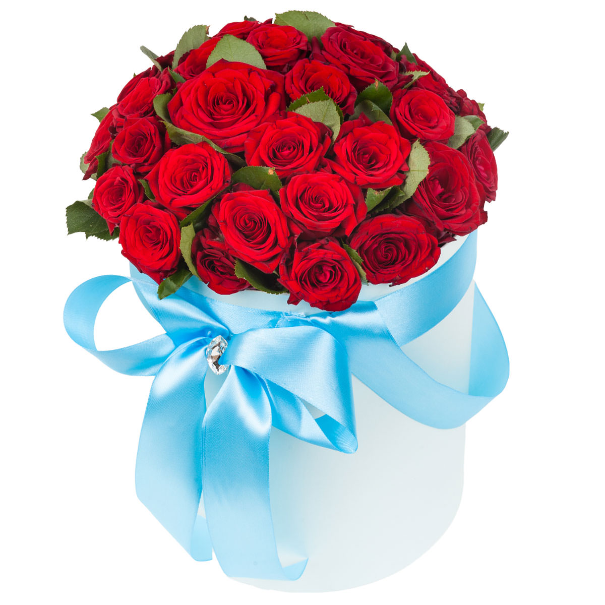 Яркие красные розы создают эффектную композицию в шляпной коробке, украшенной голубой атласной лентой. Этот букет станет прекрасным подарком для любимой на 14 февраля. Возможны варианты оформления в бархатной или дизайнерской коробке.