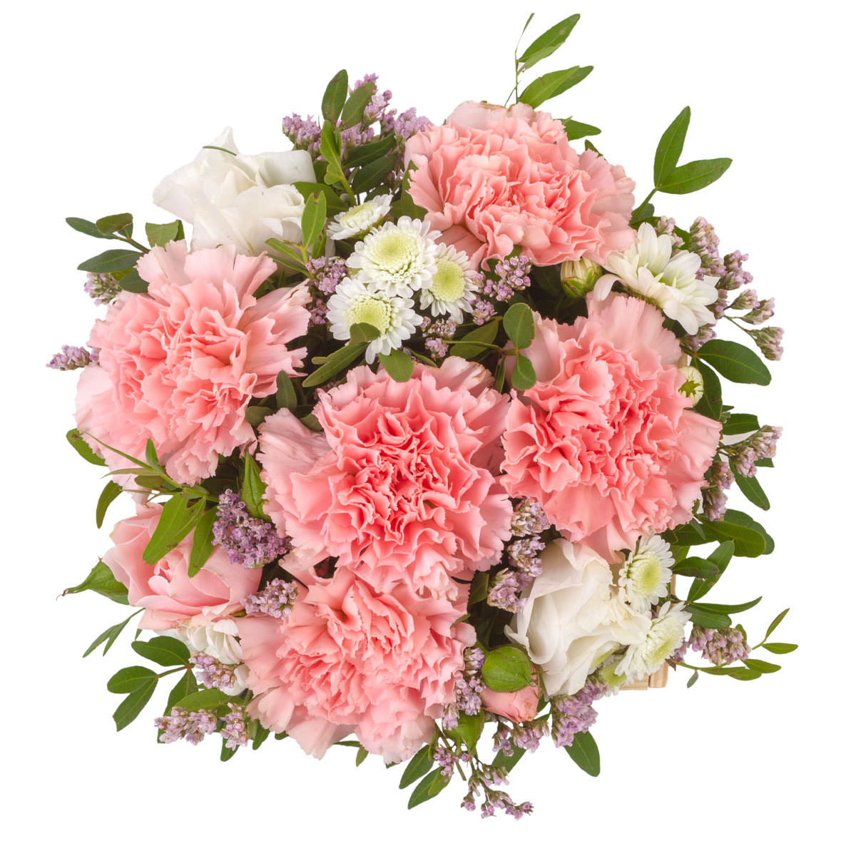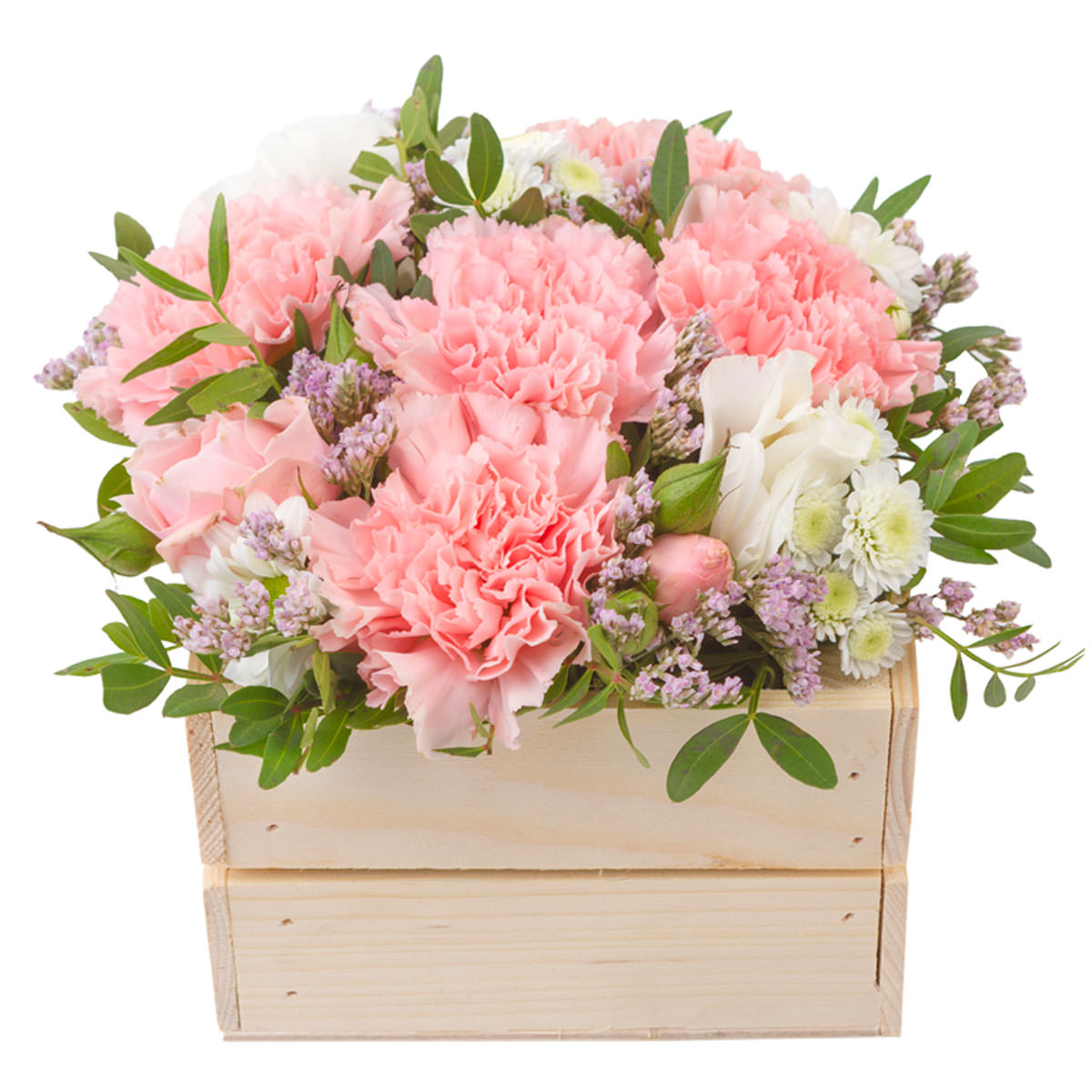 Розовые гвоздики и белые кустовые хризантемы создают нежную палитру, дополненную изящной статицей и свежей фисташкой. Композиция представлена в натуральной деревянной корзине, которая подчеркивает природную красоту цветов. Возможны альтернативы оформления: корзина из лозы или плетёная корзина. Прекрасный подарок для любимой на день рождения или годовщину.