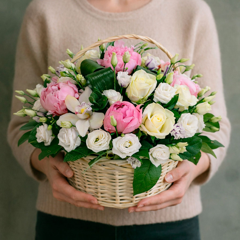 Розовые пионы, кремовые розы и орхидеи, белые эустомы и зелень аспидистры создают нежную и изысканную композицию. Корзина из натурального материала придаёт букету естественность и лёгкость. Возможны альтернативы оформления: плетёная корзина или корзина из ротанга. Прекрасный выбор для подарка на день рождения для любимой.